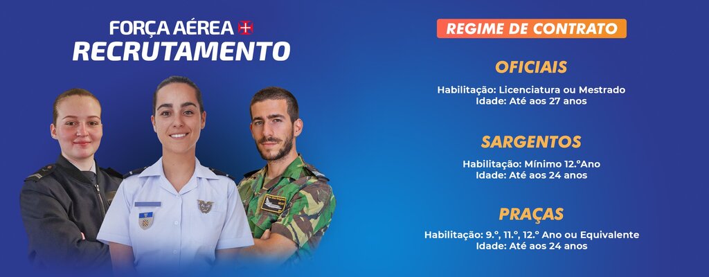 A Força Aérea tem abertas 500 vagas para concurso de admissão ao Regime de Contrato, para as categorias de Oficiais, Sargentos e Praças.
