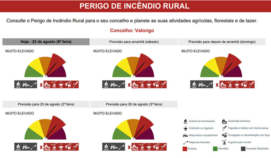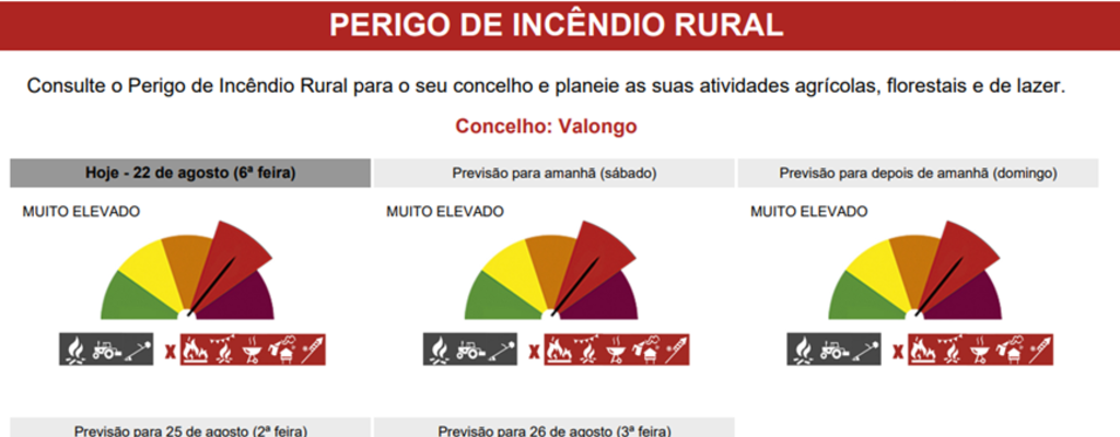 De acordo com as previsões do IPMA, o Perigo de Incêndio Rural estará no nível «muito elevado» no concelho de Valongo, nos próximos dias.