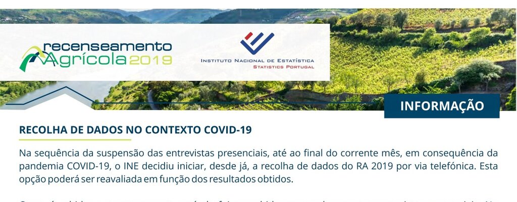 O Instituto Nacional de Estatística (INE) está a realizar o Recenseamento Agrícola 2019 (RA 2019) cujos dados, tendo em conta o conjunto de medidas relacionadas com o coronavírus Covid-19, irão passar a recolhidos por entrevista telefónica.