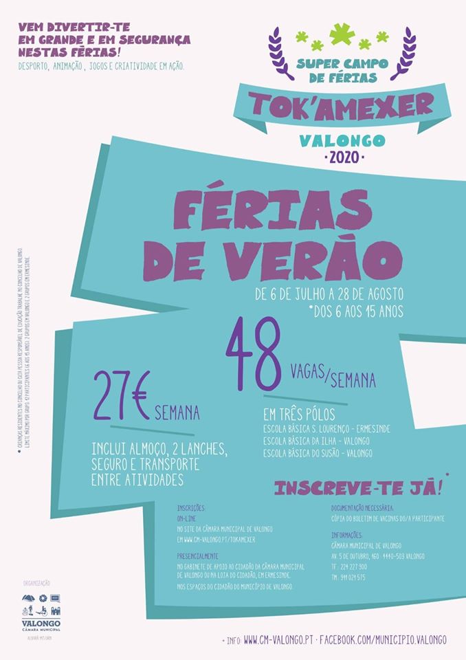 O programa TOK'A MEXER VALONGO - Férias de Verão está de regresso, agora num formato adaptado às novas exigências de saúde pública. Irá decorrer de 6 de julho a 28 de agosto. O cronograma das atividades foi adaptado à nova realidade, para garantir diversão com segurança e distanciamento físico, salvaguardando a segurança quer das crianças, quer dos monitores.