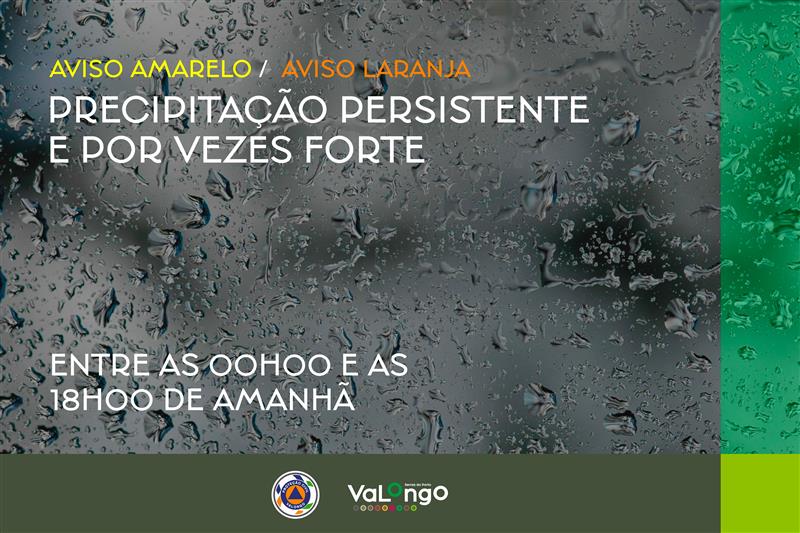 Aviso - Precipitação persistente e por vezes forte entre as 00h00 e as 18h00 do dia 10 de fevereiro