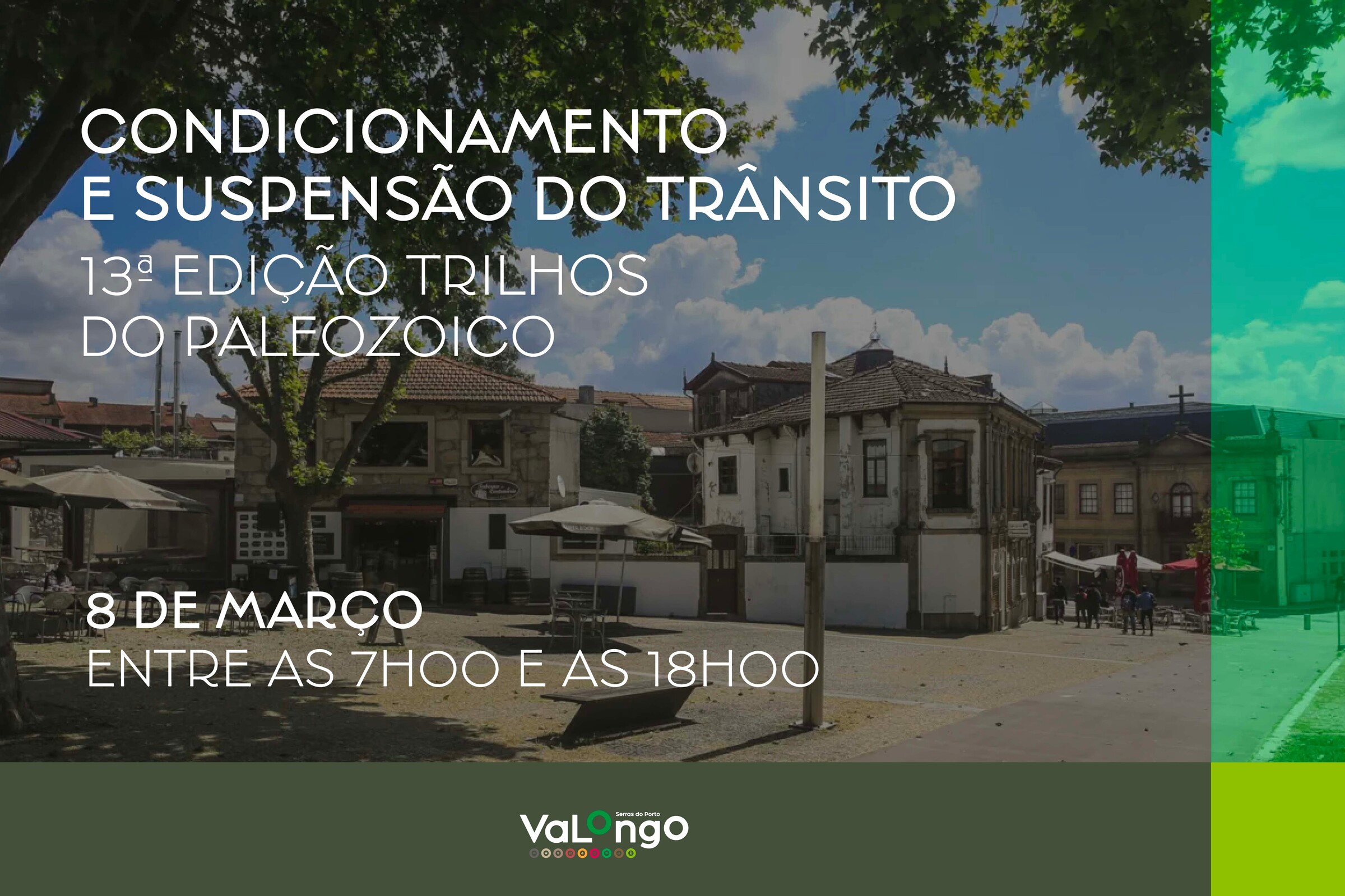 Comunica-se à população em geral que, no próximo dia 8 de março, por motivo da realização do evento desportivo denominado "13.ª Edição Trilhos do Paleozoico", promovido pelo Grupo Dramático e Recreativo da Retorta em coorganização com a Câmara Municipal de Valongo, haverá condicionamento e suspensão à circulação automóvel nos arruamentos da freguesia de Valongo que integram o percurso da referida prova, nos seguintes moldes: