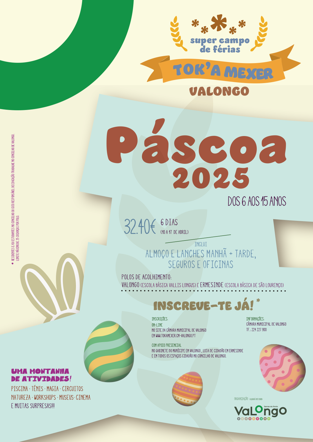 A edição de Páscoa do campo de férias Tok'a Mexer, promovido pela Câmara Municipal de Valongo, está quase a chegar. As inscrições arrancam no dia 17 de março, pelas 09h30. Saiba todas as informações em https://www.tokamexer.cm-valongo.pt/ .