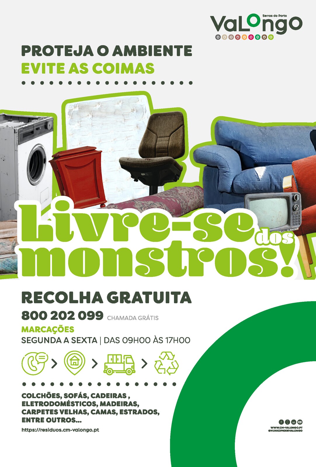 Com um simples telefonema para o número 800 202 099 pode livrar-se dos "monstros" indesejados que tem em casa. Colchões, móveis, estrados, sofás, eletrodomésticos, são alguns dos equipamentos recolhidos gratuitamente. Com este serviço, a autarquia presta um apoio fundamental aos/às munícipes ajudando-os/as a proteger o ambiente e a evitar coimas por deposição ilegal de resíduos.