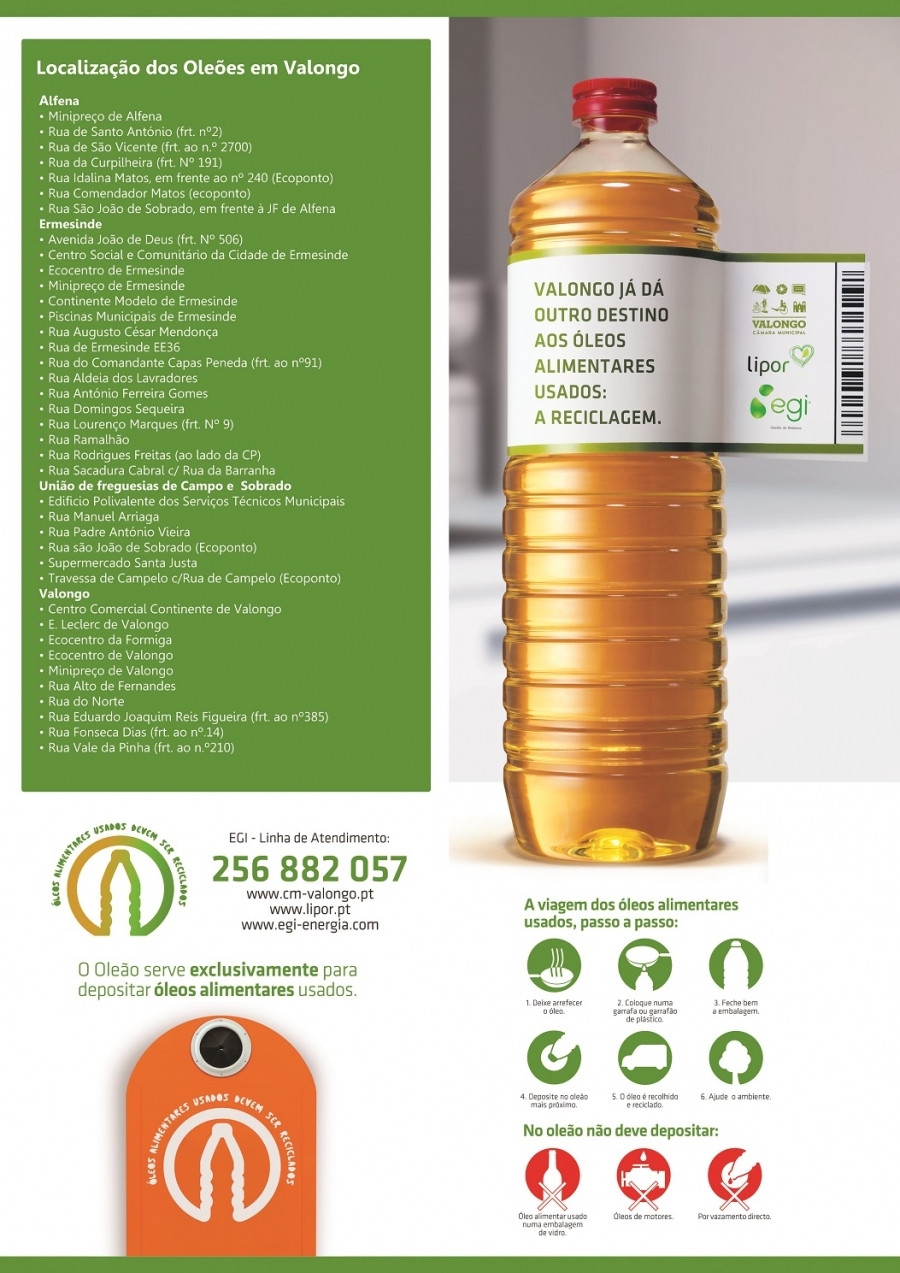 Esses oleões foram colocados no âmbito do projeto resultante da parceria entre os Municípios, a LIPOR e a EGI - Gestão de Resíduos, que é a entidade responsável pela recolha e valorização dos óleos alimentares usados, assim como pela manutenção e limpeza dos oleões.