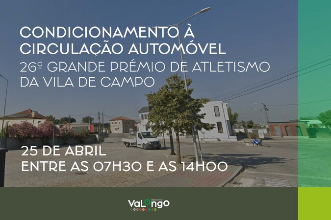 Comunica-se à população em geral, que no próximo dia 25 de abril, por motivo da realização do evento desportivo denominado “26.º Grande Prémio de Atletismo da Vila de Campo”, coorganizado pela Junta de Freguesia de Campo e Câmara Municipal de Valongo, ocorrerá condicionamento à circulação automóvel em diversos arruamentos, conforme o percurso das provas, com início às 07h30 e término às 14h00.