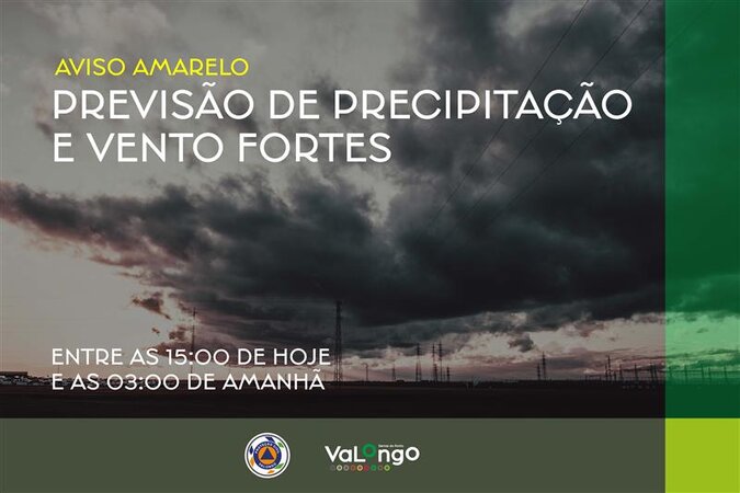 Aviso - Previsão de precipitação e vento fortes, entre as 15h00 de hoje até às 03h00 de amanhã, dia 23 de janeiro.
