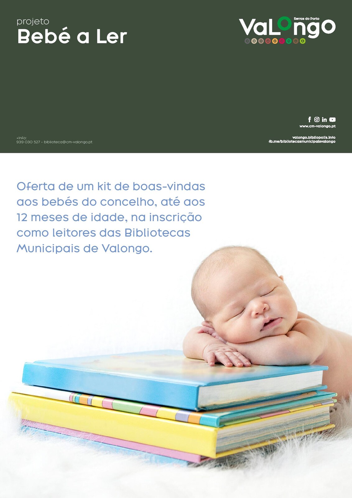 A Biblioteca Municipal de Valongo tem um novo projeto. Chama-se "Bebé a Ler" e consiste na oferta de um kit de boas-vindas aos bebés do concelho, até aos 12 meses de idade, na inscrição como leitores das Bibliotecas Municipais de Valongo.