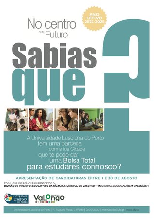 À semelhança de anos anteriores, o Município de Valongo irá proceder à receção de candidaturas e seleção de um/a estudante residente no concelho de Valongo, para beneficiar de uma Bolsa de Estudo a atribuir pela Universidade Lusófona do Porto.