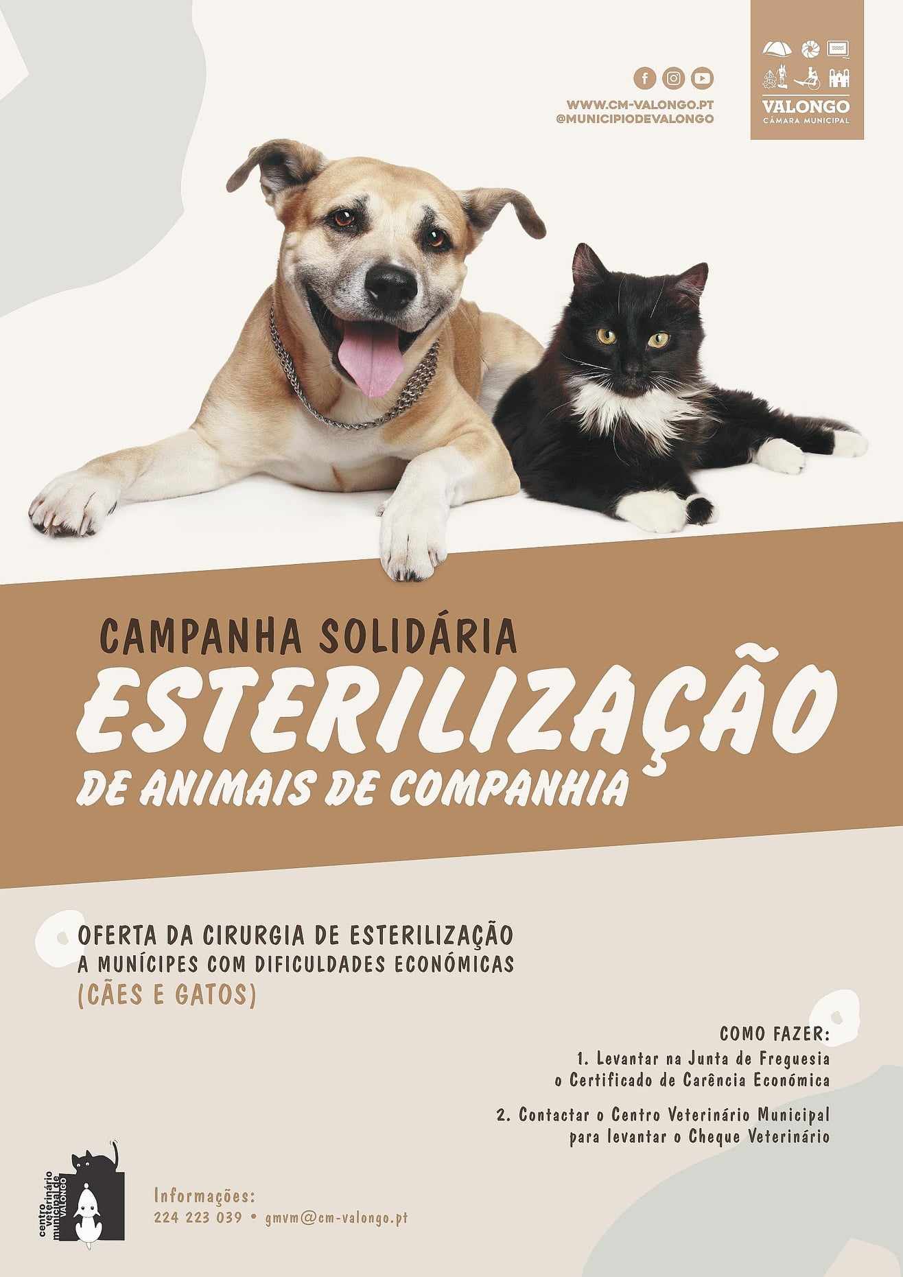 Sob o lema "Esterilizar é cuidar" e sabendo que cada animal esterilizado vive mais tempo, com menos doenças e menos agressividade, contribuindo para que haja menos abandono de animais, a Autarquia de Valongo lança esta nova fase da campanha solidária de esterilização com oferta desta cirurgia, suportando inteiramente os custos numa das clínicas veterinárias aderentes.