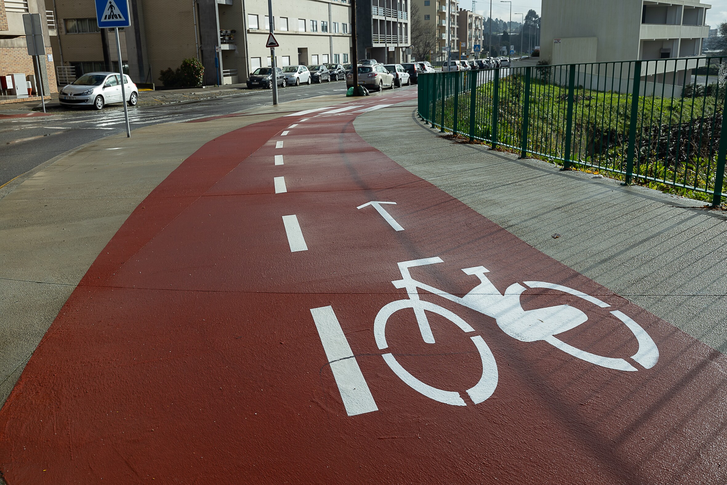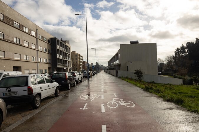 Nos troços inseridos em passeios, foi opção colocar a ciclovia de forma a proteger os ciclistas de aberturas descuidadas de portas dos veículos estacionados, mas também proteger os peões, nas saídas/entradas das suas habitações, de impactos por ciclistas distraídos.