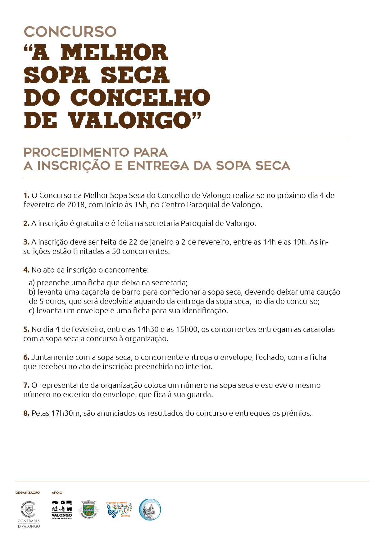 A inscrição, limitada a 50 concorrentes, é gratuita e pode ser feita na Secretaria Paroquial de Valongo de 22 de janeiro a 02 de fevereiro, entre as 14 e as 19h.