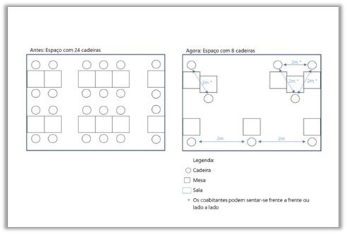A disposição das mesas e das cadeiras deve garantir uma distância de, pelo menos, dois metros entre as pessoas, mas os coabitantes podem sentar-se frente a frente ou lado a lado, a uma distância inferior.