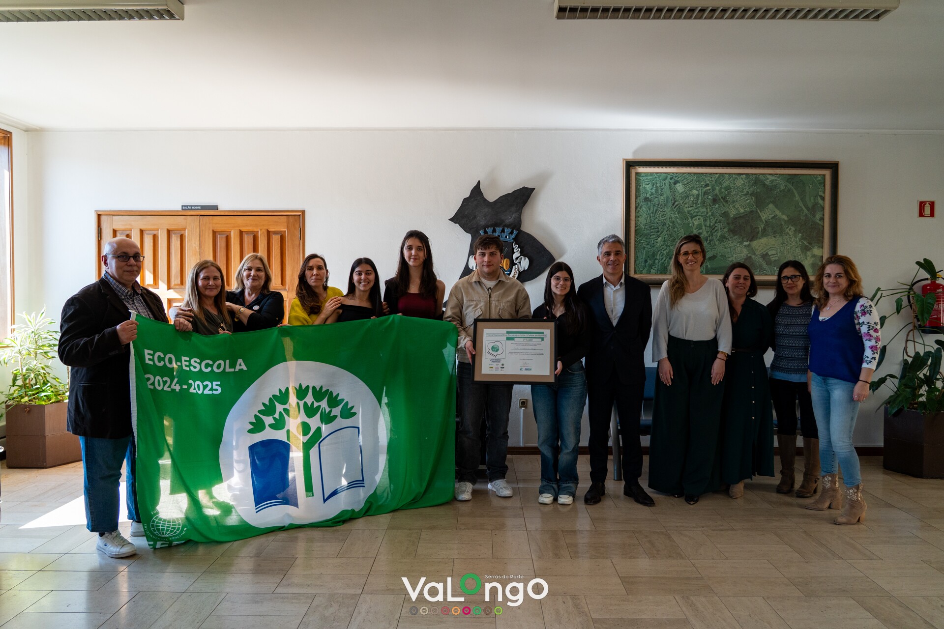 Os alunos e professores da Escola Secundária de Valongo que participaram no desafio Eco‑Cozinheiros 2025‑2026 foram recebidos nos Paços do Concelho pelo Presidente da Câmara Municipal de Valongo, Paulo Esteves Ferreira, e pela Vereadora do Ambiente, Cláudia Lima. Durante a receção, os autarcas felicitaram a equipa pelo excelente desempenho e destacaram a importância da participação neste tipo de iniciativas, que consideram um modelo inspirador para a promoção de práticas alimentares responsáveis e de sustentabilidade no concelho.