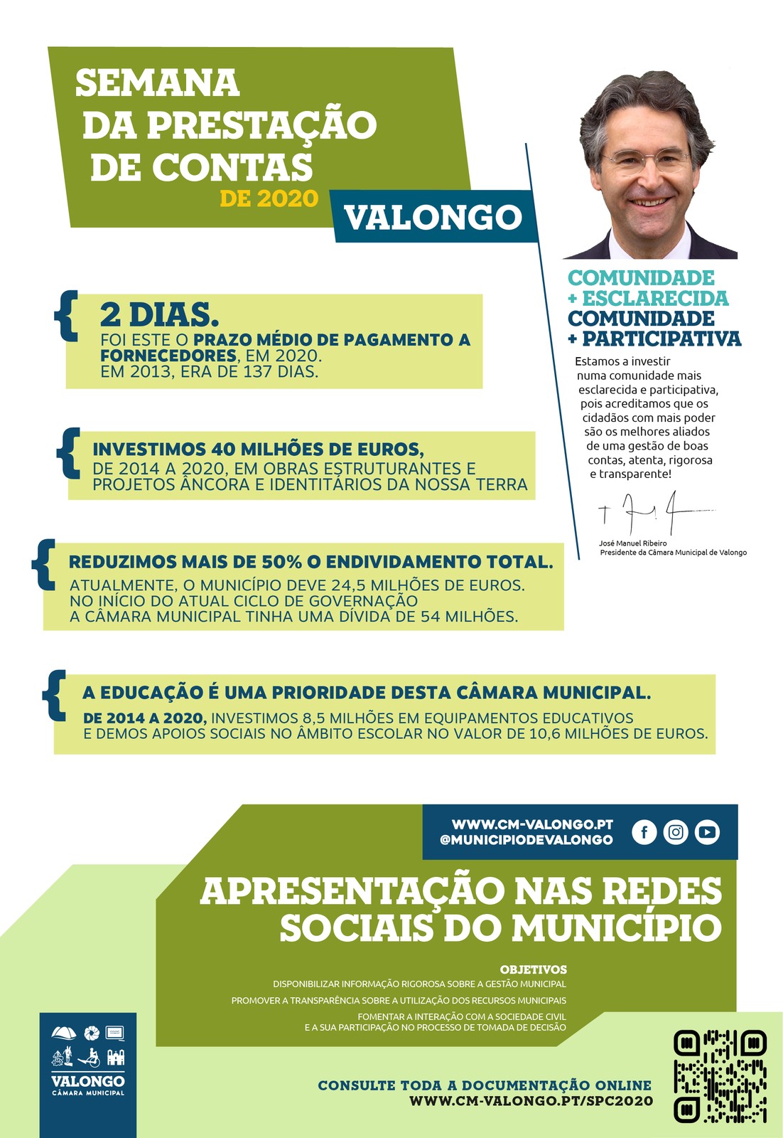 “Mais do que nunca temos de apostar no reforço da cidadania e no empoderamento de toda a comunidade. Prestar contas é um dever que assumimos durante todo o ano, disponibilizando no site do Município informação atualizada com os custos de tudo aquilo que fazemos, sejam obras por adjudicação ou por administração direta, eventos culturais ou desportivos”, salienta o Presidente da Câmara Municipal de Valongo, José Manuel Ribeiro.