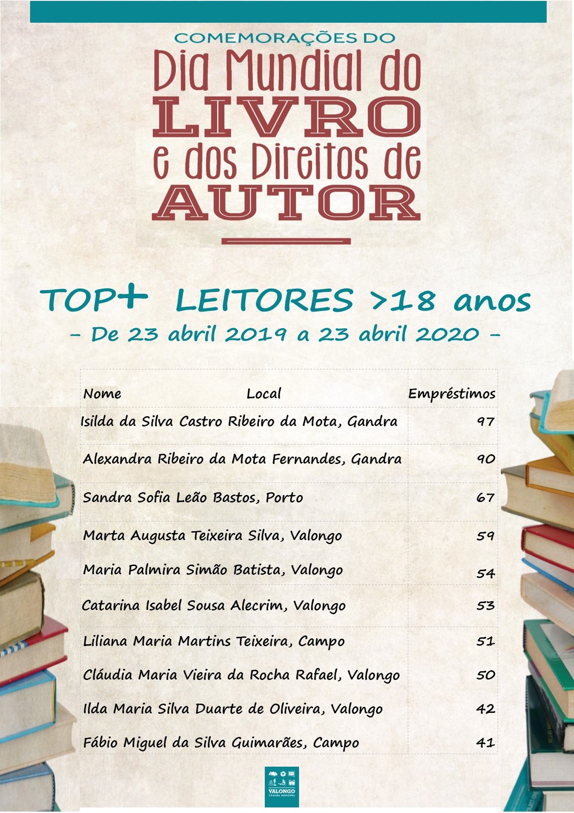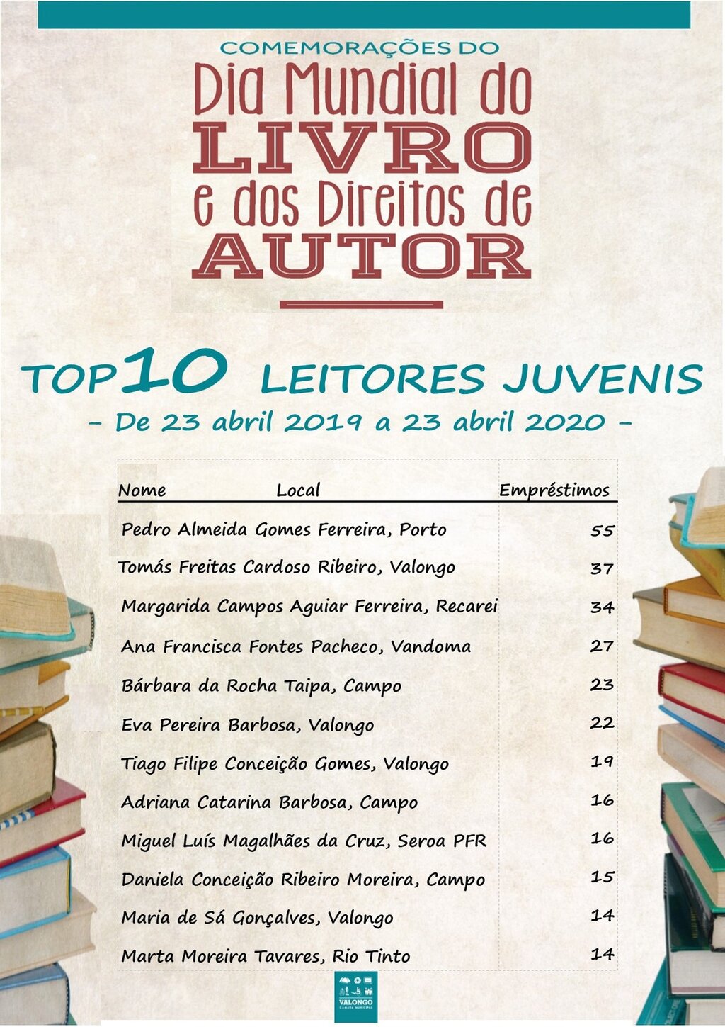 A Biblioteca Municipal de Valongo associou-se às comemorações do Dia Mundial do Livro e dos Direitos de Autor, premiando o TOP10 dos leitores infantis, juvenis e adultos com mais livros requisitados, no período de 23 abril de 2019 a 23 abril de 2020.