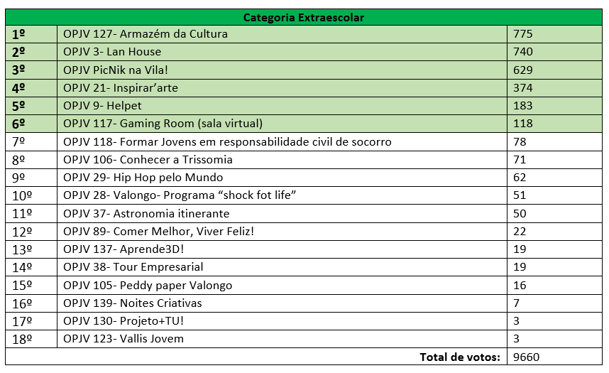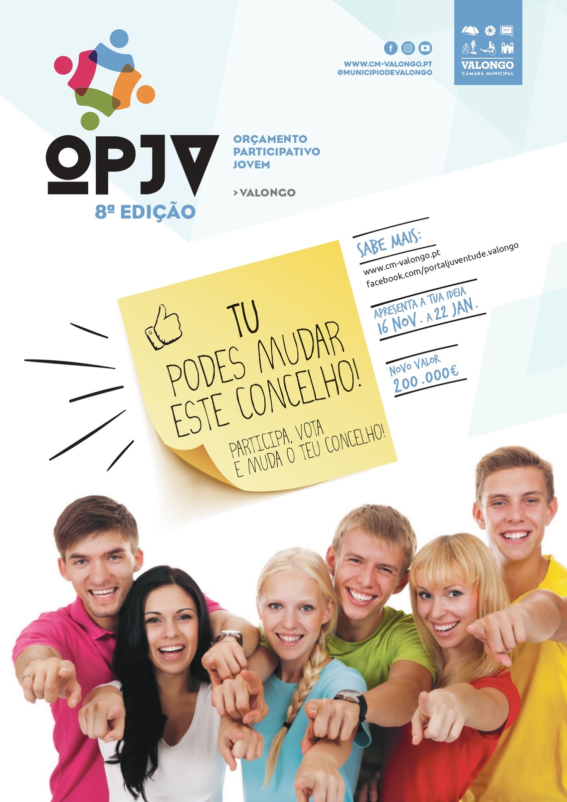A próxima edição do Orçamento Participativo Jovem de Valongo (OPJV) vai aumentar mais 50.000€, passando para o valor total de 200.000€, de modo a contemplar 20 projetos, com 10.000€ cada. Mantêm-se as 3 categorias existentes, sendo que a verba vai ser aplicada em 7 projetos escolares, 7 projetos extraescolares e 6 projetos gerações, que juntam seniores e jovens.