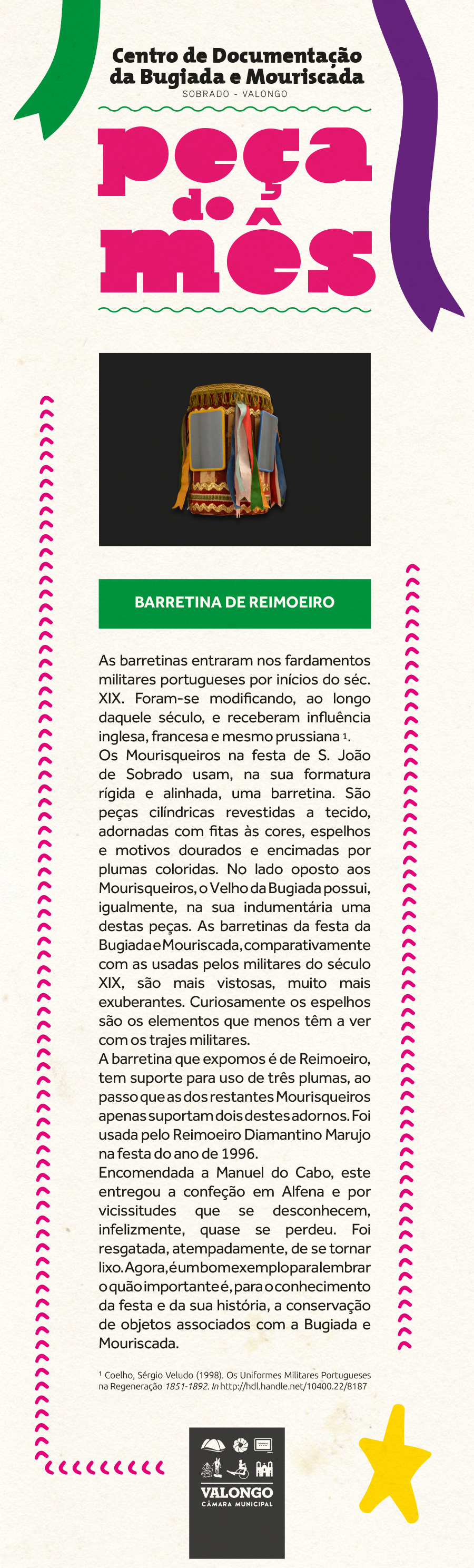 O Centro de Documentação da Bugiada e Mouriscada expõe, com respetivo enquadramento histórico, mais uma Peça do Mês. Desta feita, trata-se de uma barretina usada pelo Reimoeiro na festa de S. João de Sobrado do ano de 1996. A exibição deste interessante objeto é mote para alertar sobre a necessidade de salvaguarda de peças associadas com a Bugiada e Mouriscada.