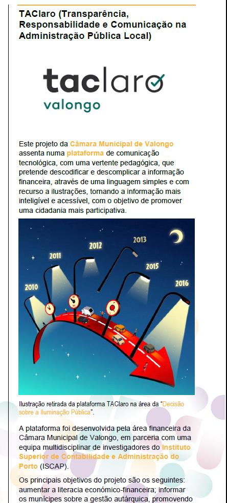 O TAClaro (Transparência, Responsabilidade e Comunicação na Administração Pública Local) é um dos quatro projetos inovadores abordados na edição de julho do Boletim Inovação na Administração Pública, que pode ser descarregado através do link: