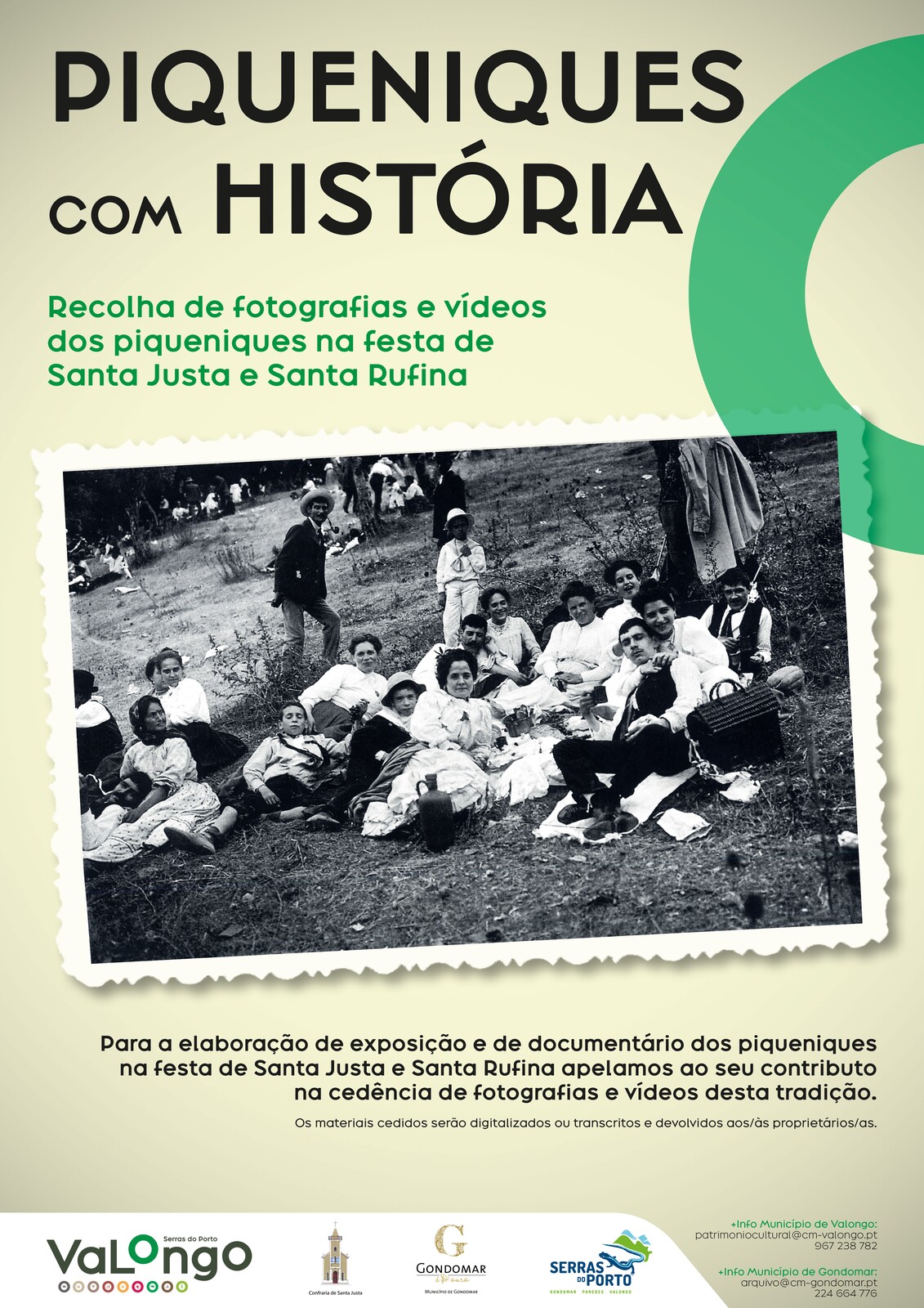 No âmbito do projeto “Piqueniques com História” o Município de Valongo, em colaboração com o Município de Gondomar, a Associação de Municípios Parque das Serras do Porto e a Confraria de Santa Justa e Santa Rufina, pretendem estudar e recuperar a prática dos piqueniques nas festividades de Santa Justa e Santa Rufina, pelo que apelam ao contributo dos munícipes para a cedência de fotografias e vídeos desta tradição, com vista à elaboração de exposição e documentário.