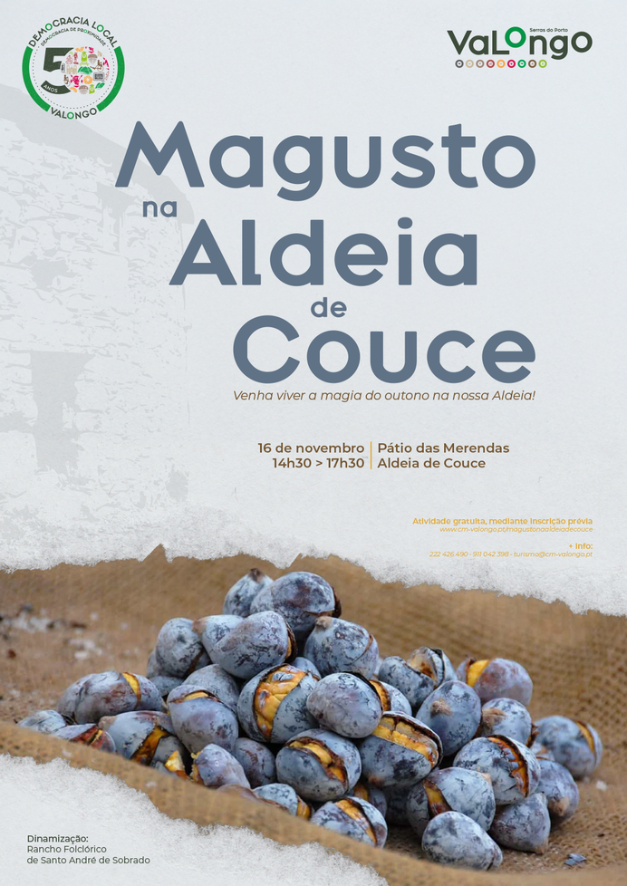 No âmbito da reclassificação da aldeia de Couce como “Aldeia de Portugal", a Câmara Municipal de Valongo promove a primeira edição do Magusto na Aldeia de Couce, no dia 16 de novembro de 2024, entre as 14h30 e as 17h30, no Pátio das Merendas (Aldeia de Couce).
