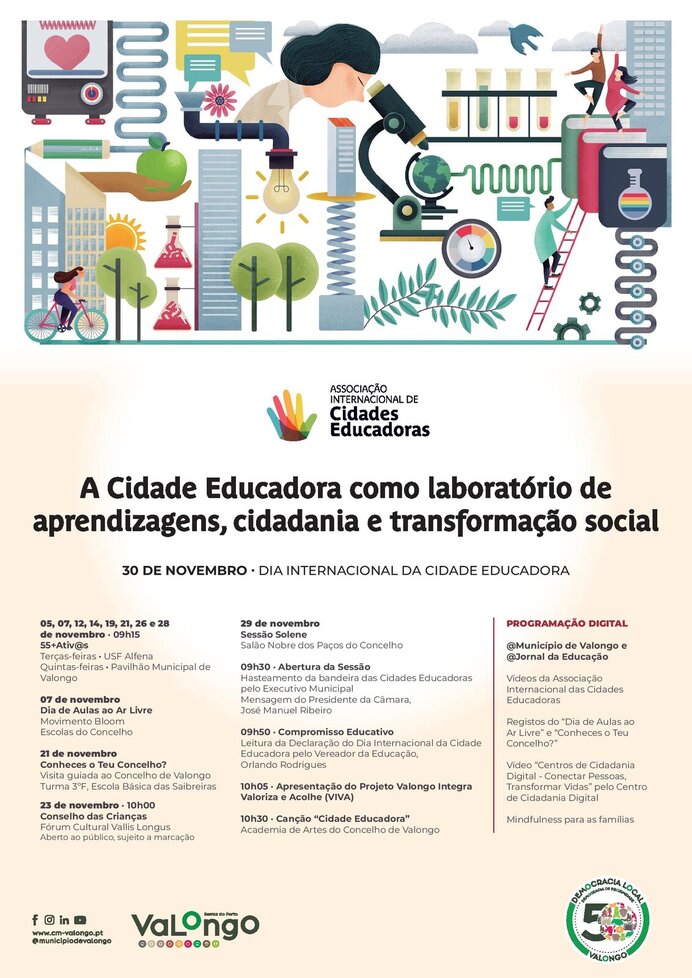 Sob o tema "A Cidade Educadora como laboratório de aprendizagens, cidadania e transformação social" comemora-se no próximo dia 30 de novembro, o Dia Internacional da Cidade Educadora. E Valongo vai assinalar a data com a realização de um vasto conjunto de iniciativas que pode consultar aqui.