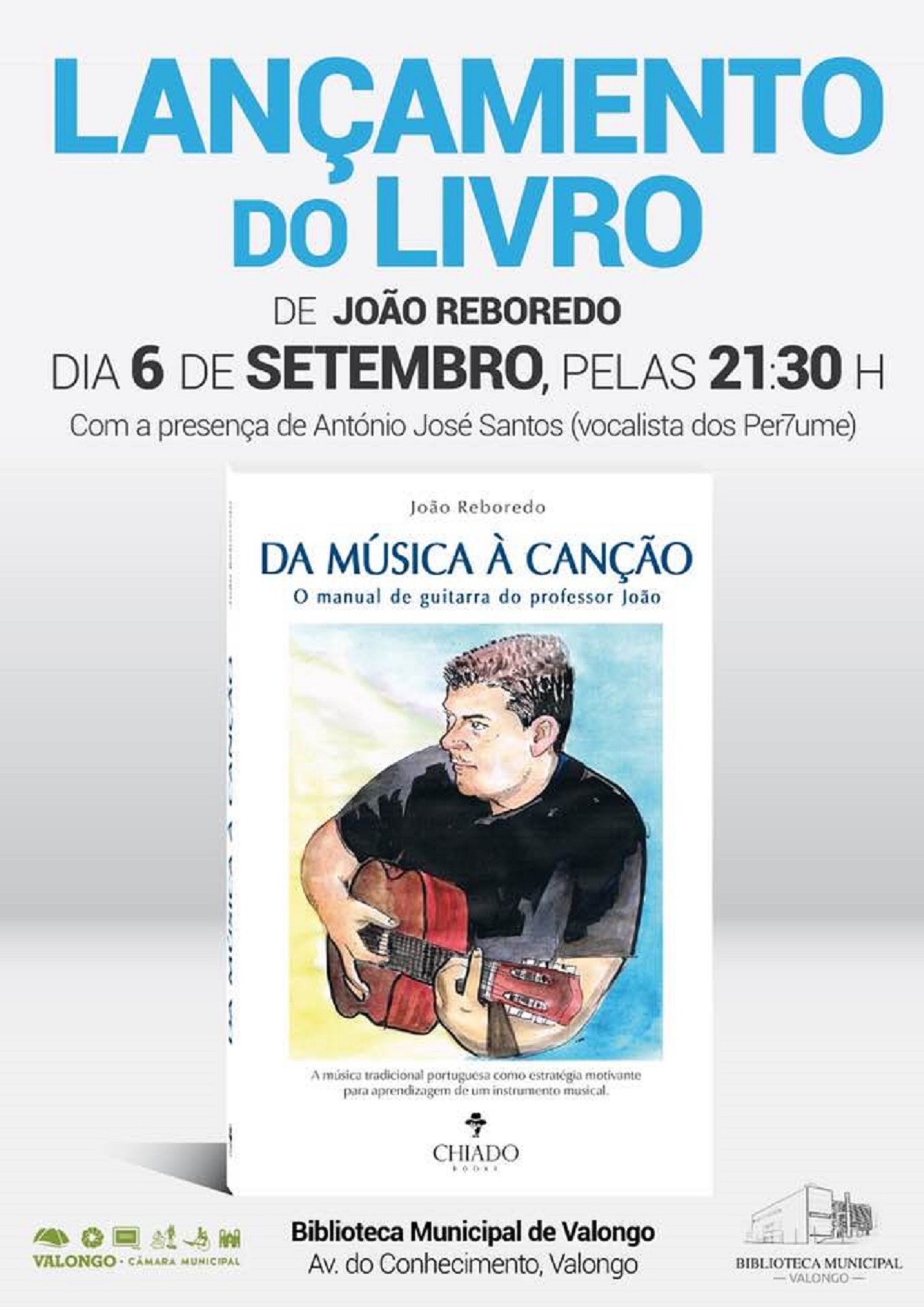 No próximo dia 06 setembro, pelas 21h30, a Biblioteca Municipal de Valongo recebe o autor João Reboredo, para o lançamento da sua sua obra “Da música à canção: o manual de guitarra do professor João”, da Chiado Editora.