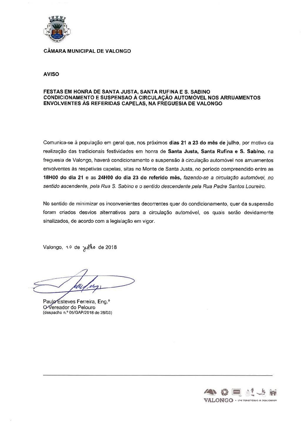 Interrupções de trânsito: Festas em honra de Santa Justa, Santa Rufina e São Sabino