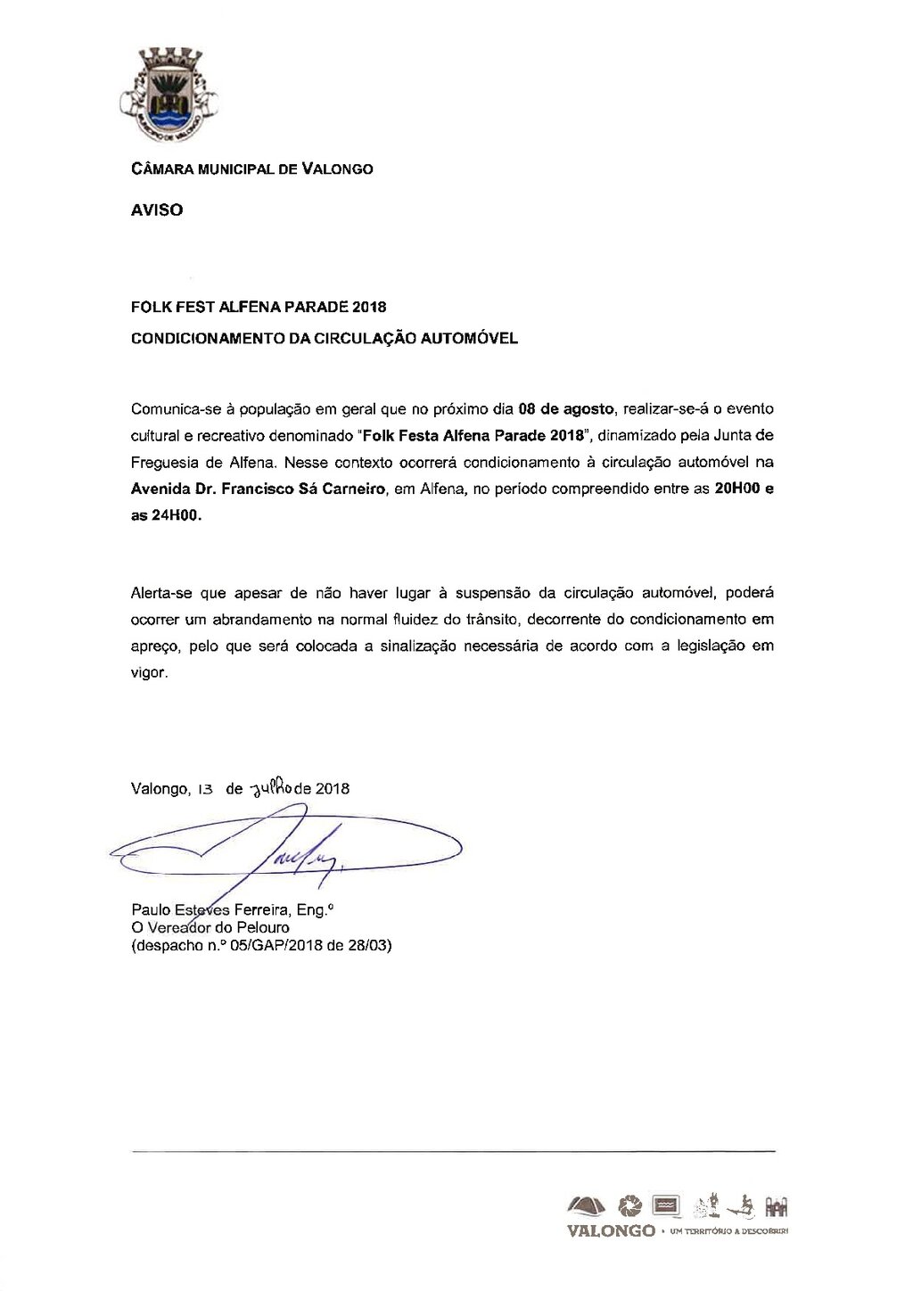 Interrupções de trânsito: Folk Festa Alfena Parade 2018