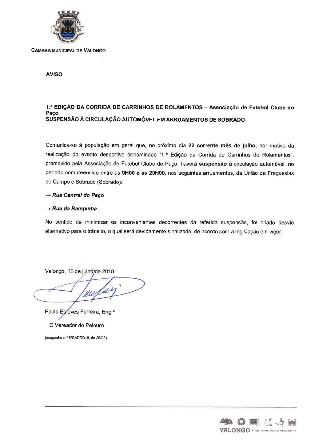 Devido à realização do evento recreativo “1.ª Edição da Corrida de Carrinhos de Rolamentos”, no próximo dia 22 do corrente mês de julho, ocorrerá suspensão ao trânsito automóvel em arruamentos de Sobrado.