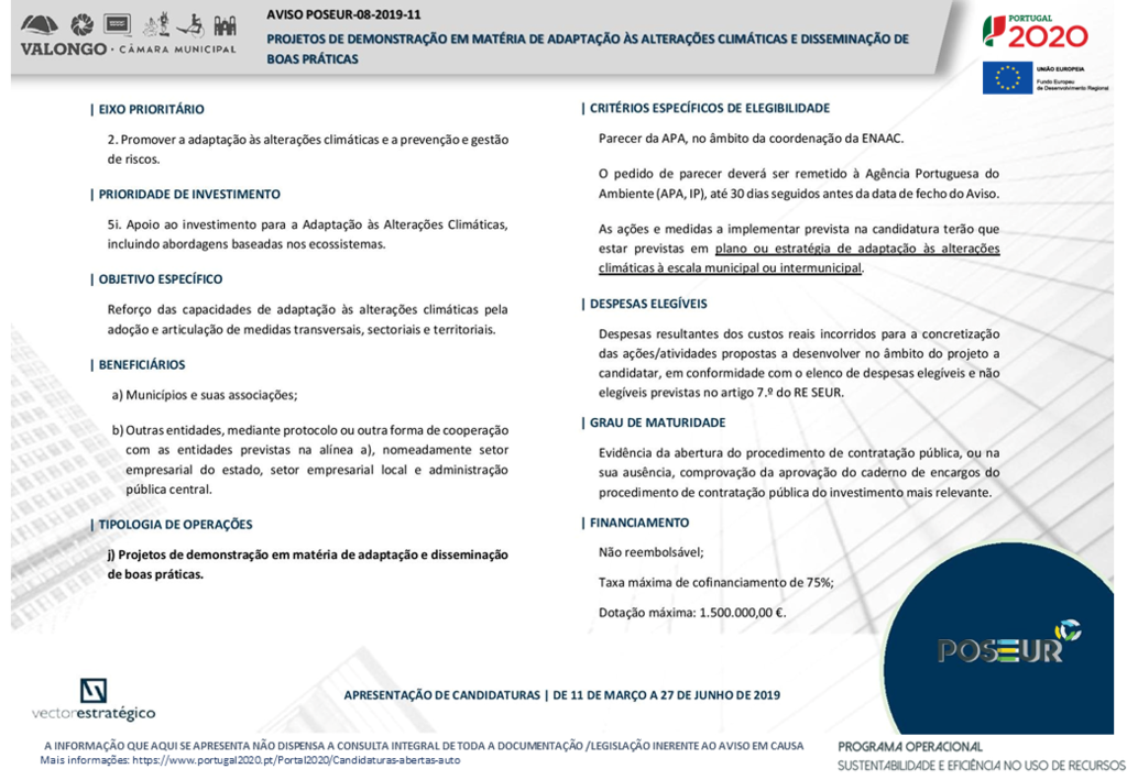 Aviso POSEUR _08_2019_11 PROJETOS DE DEMONSTRAÇÃO EM MATÉRIA DE ADAPTAÇÃO ÁS ALTERAÇÕES CLIMÁTICAS E DISSEMINAÇÃO DE BOAS PRÁTICAS