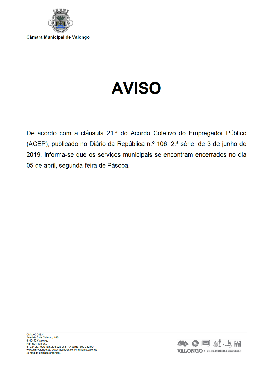 Encerramento dos serviços municipais na segunda-feira de Páscoa
